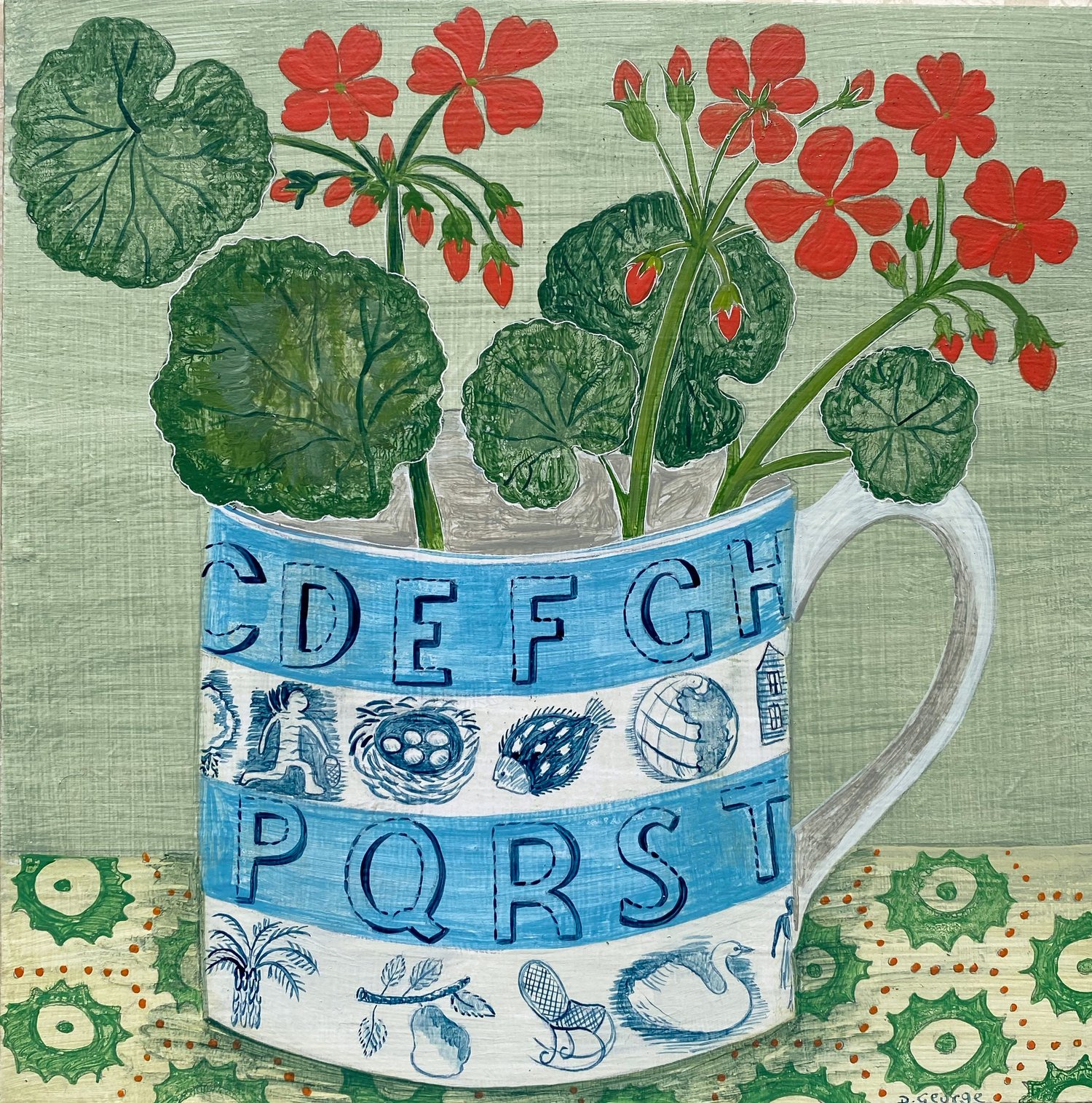 'Alphabet cup and Geraniums' Giclee print, printed on high quality Hahnemuhle watercolour paper. The image area of the print measures 15 x 15 cm.