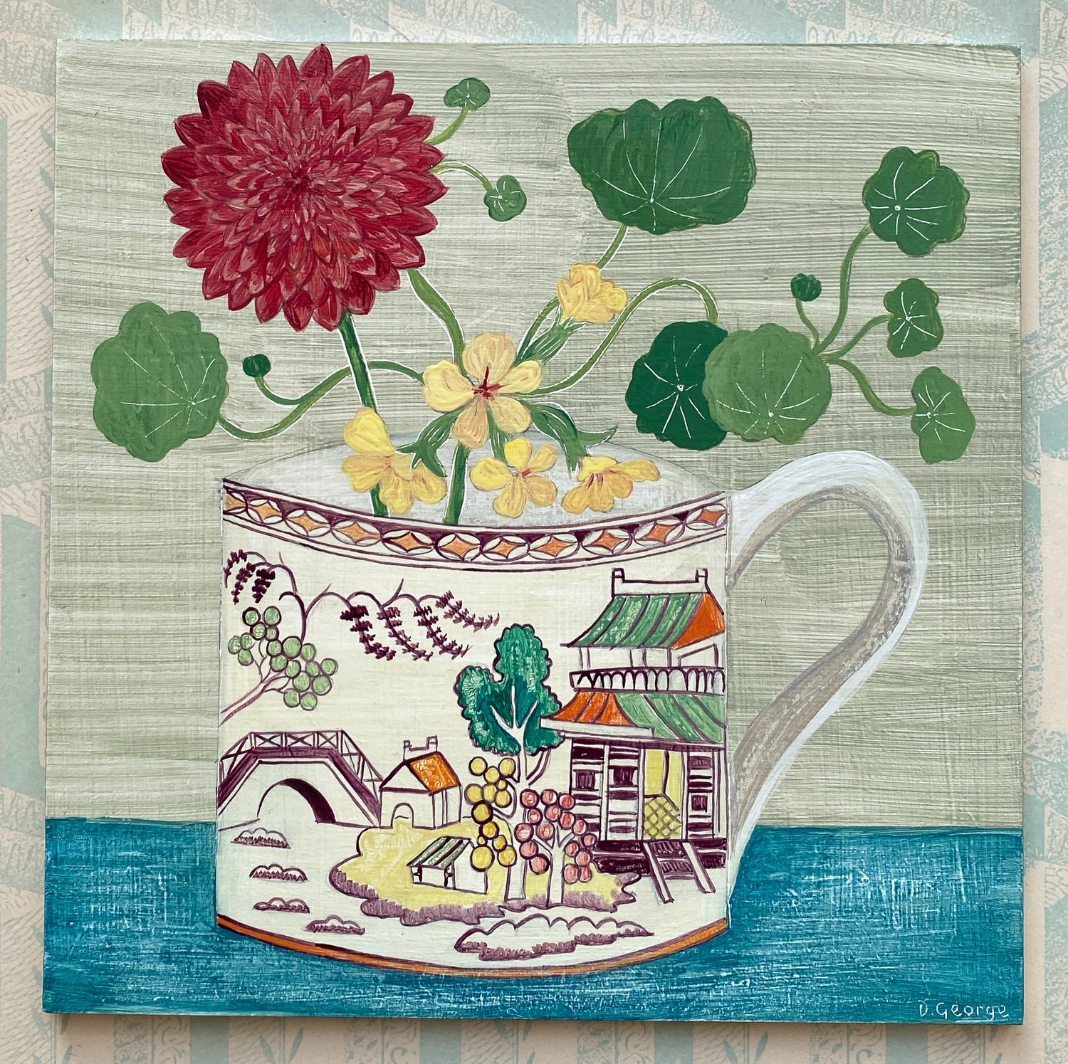 A new painting on gessoed board inspired by an antique cup depicting a colourful willow pattern design and some miniature nasturtiums.