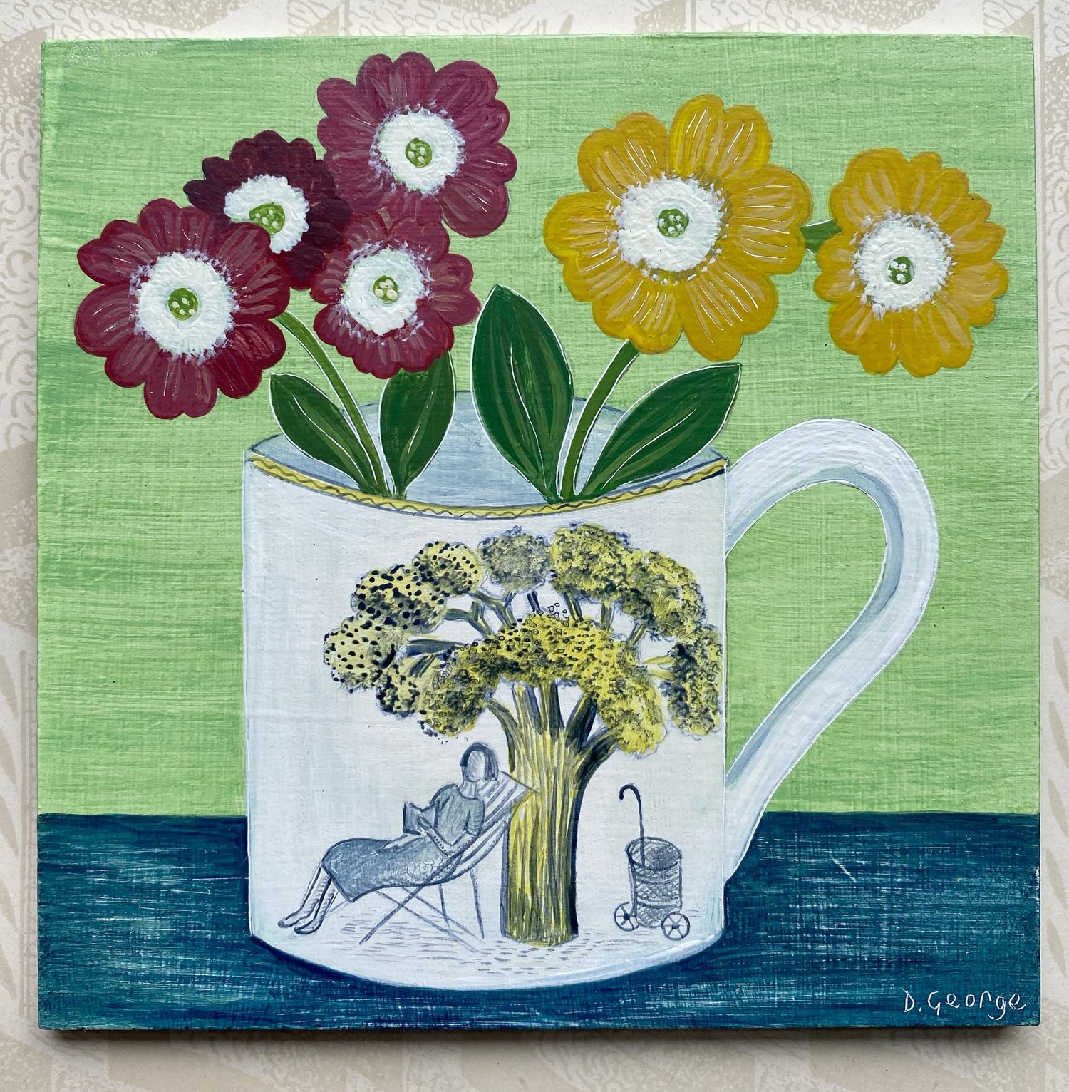 A new small painting on gessoed board. Inspired by an Eric Ravilious illustration and Auriculas from my Garden.