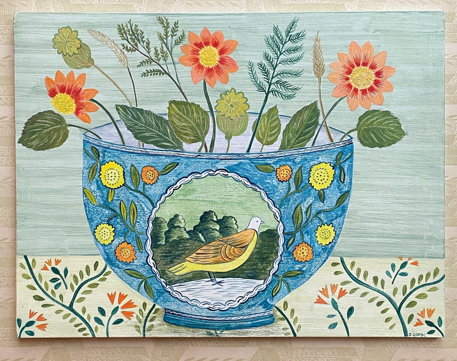 My first painting of 2024. 'Bird bowl and orange flowers' inspired by an antique transferware pattern.