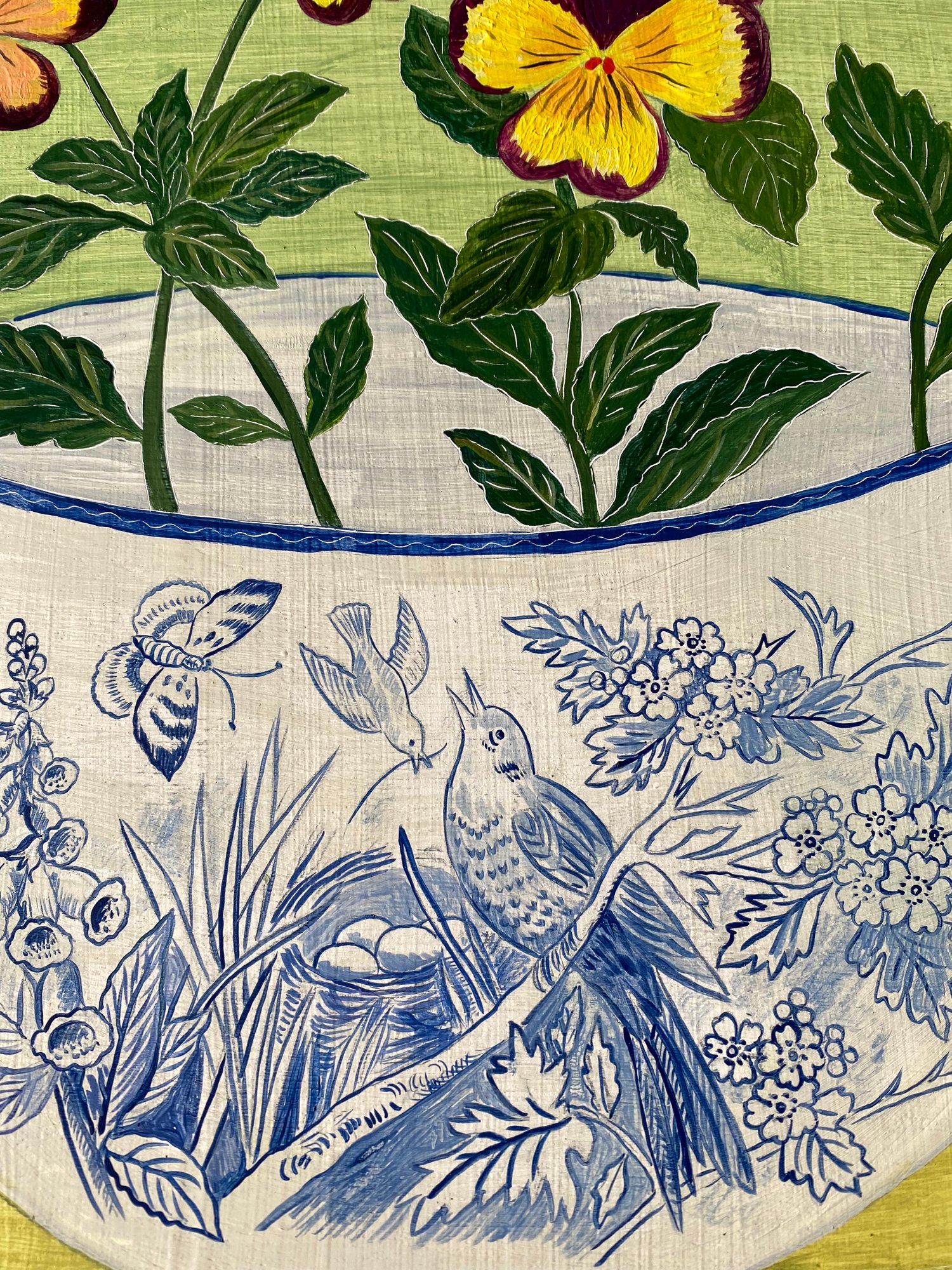 A new painting on gessoed board inspired by an antique transferware illustration depicting a bird and Hawthorn.