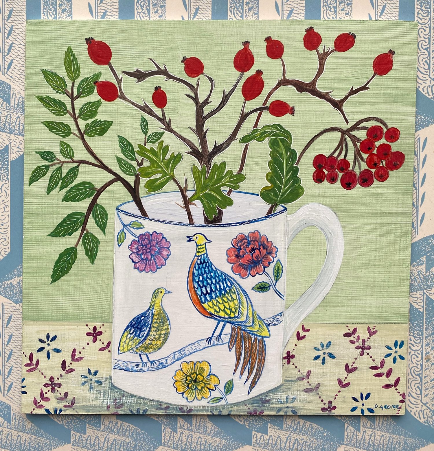 A new painting on gessoed board inspired by an antique transferware illustration and some autumn berries.