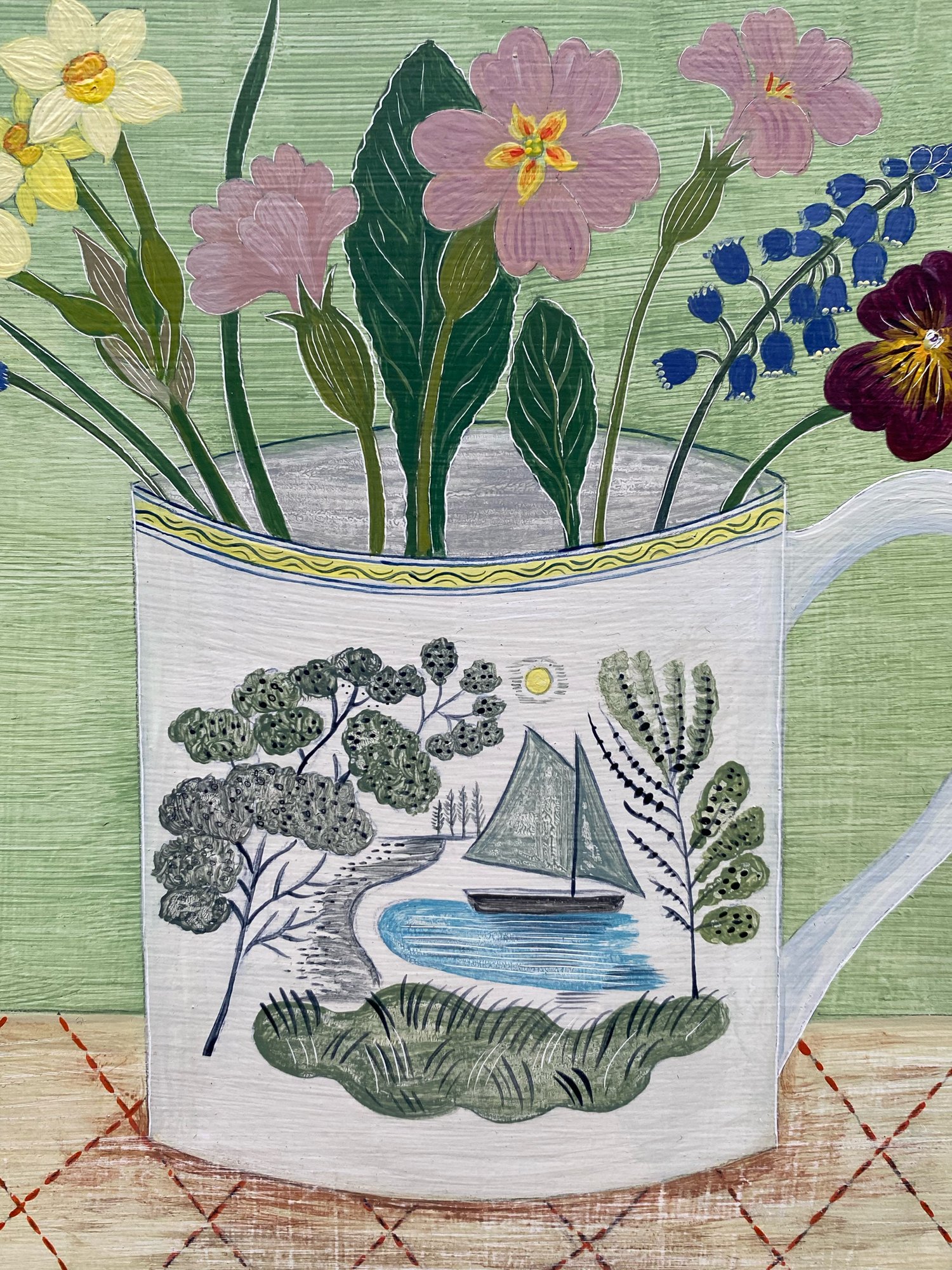 A new painting on gessoed board inspired by an illustration by Eric Ravilious and spring flowers from my garden.