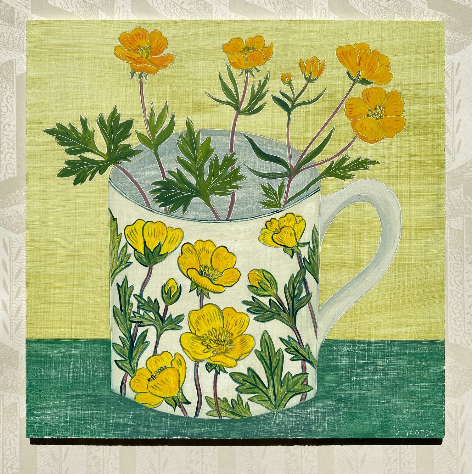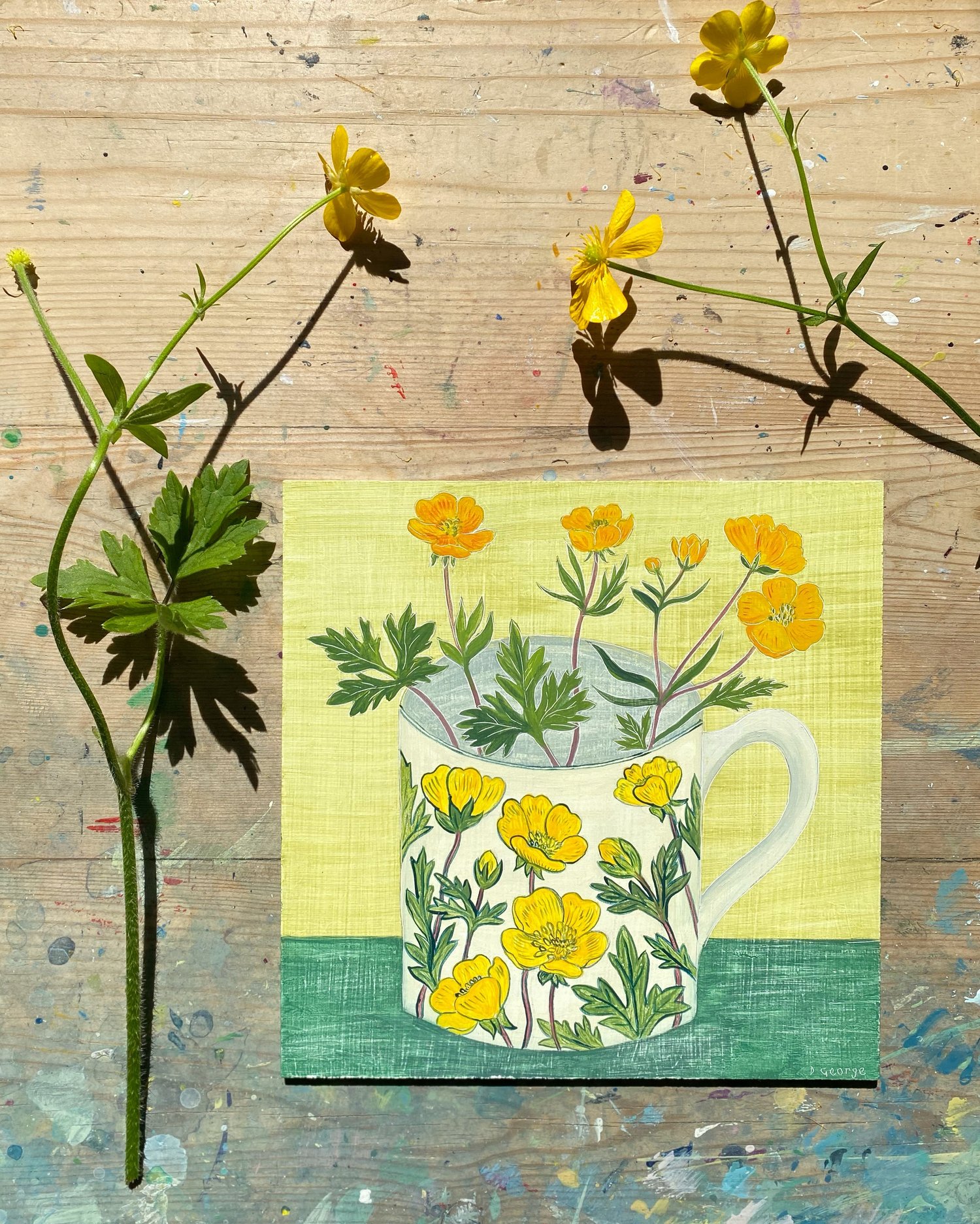 A new painting on gessoed board, inspired by vintage wild flower illustrations and buttercups from my garden.