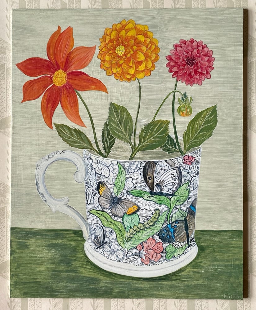 A new painting on gessoed board inspired by an antique transferware cup and Dahlias from my garden.