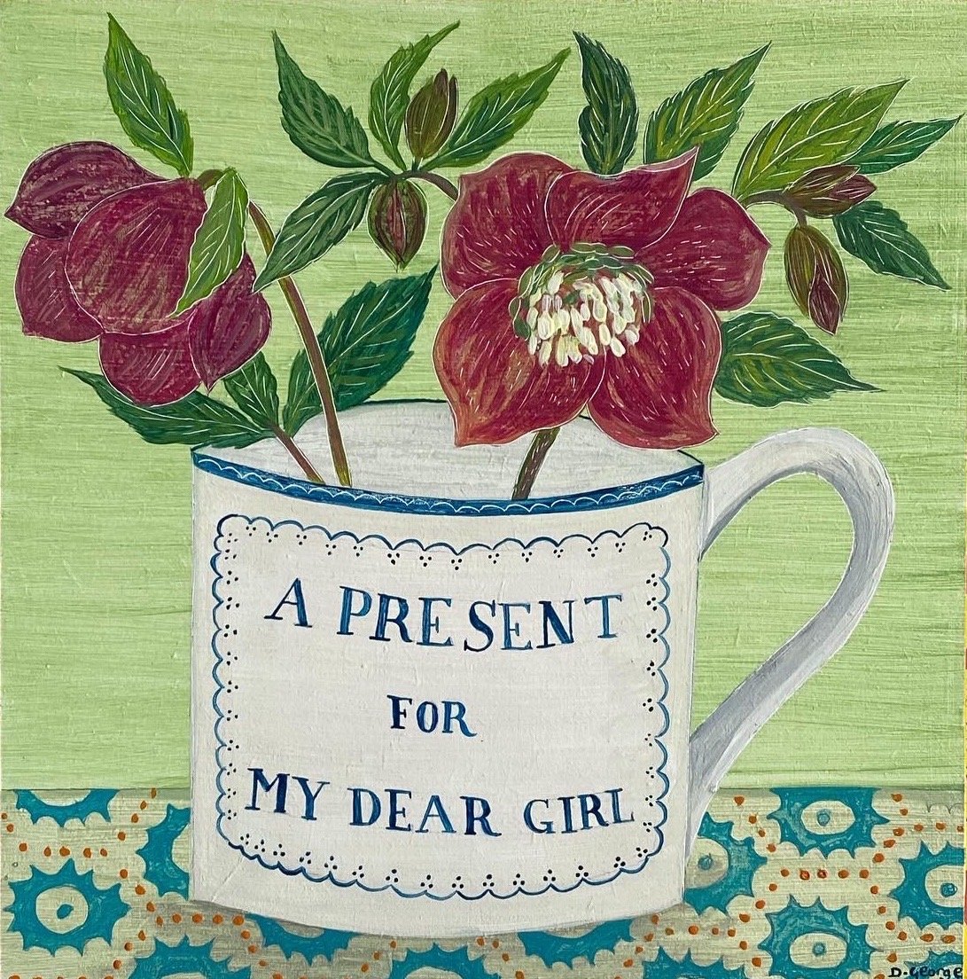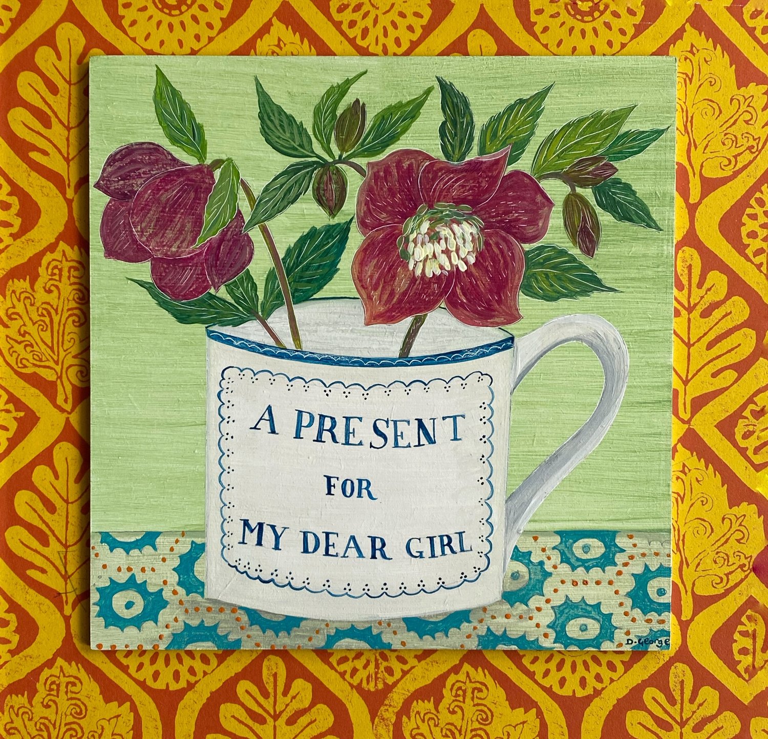 A new painting on gessoed board, inspired by an antique child's motto cup.