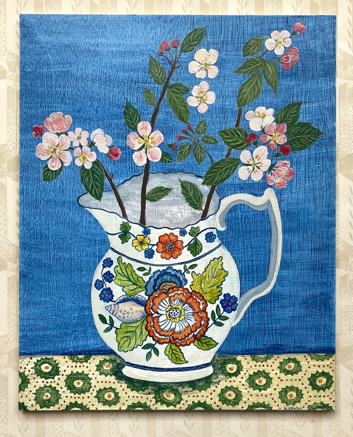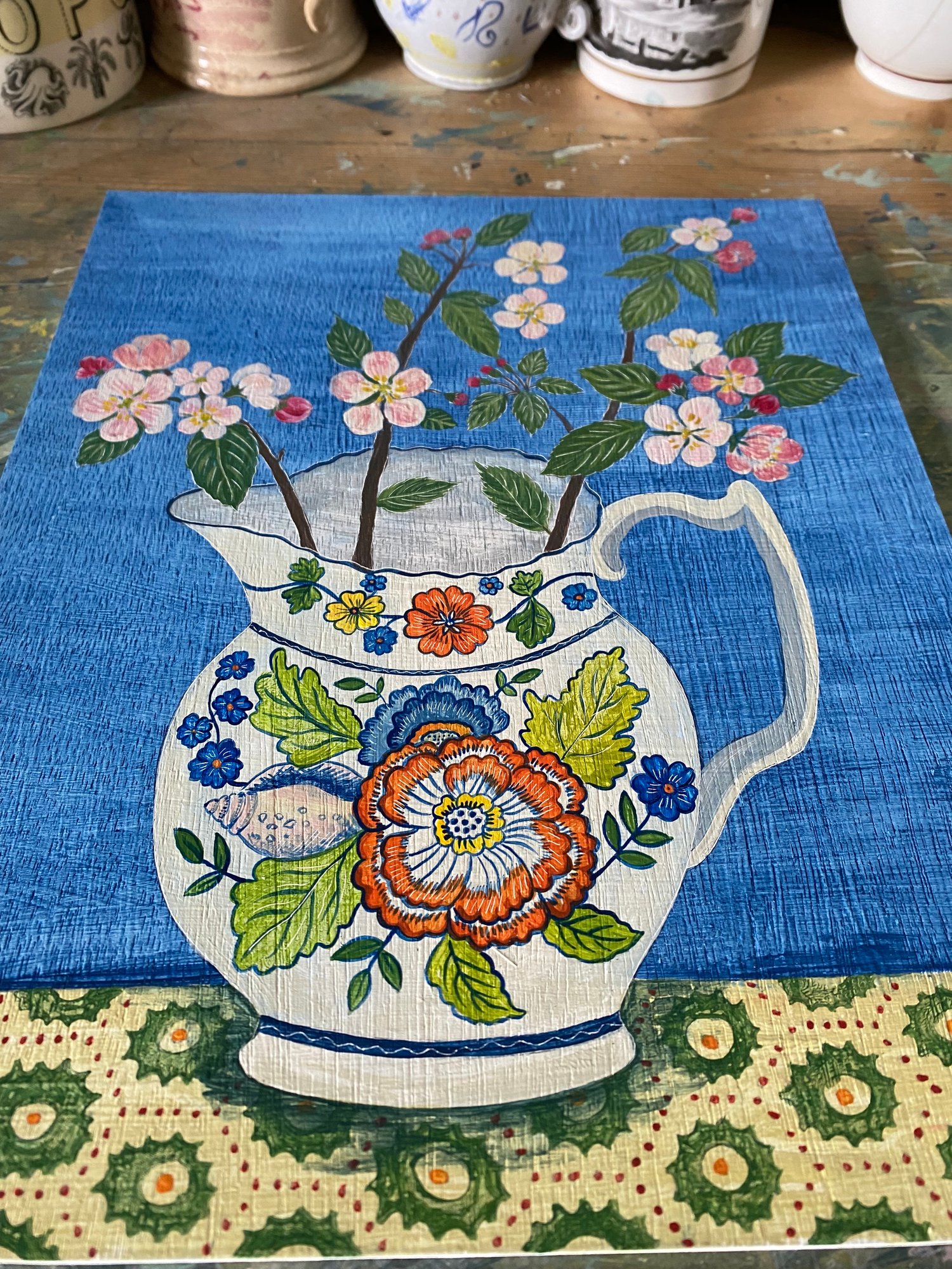 A new painting on gessoed board inspired by an antique floral jug and apple blossom.