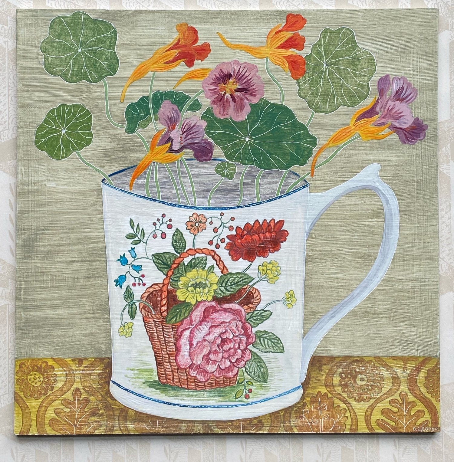 A new painting on gessoed board inspired by a design on an antique plate and nasturtiums from my garden.