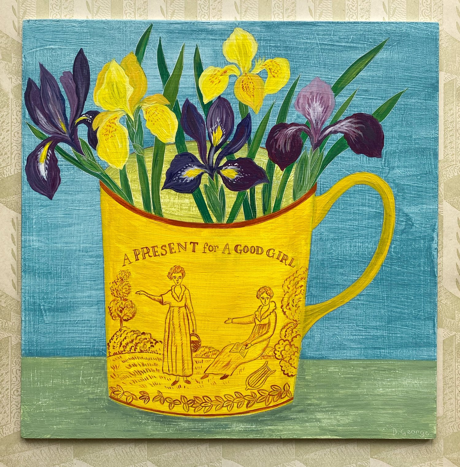 A new painting on gessoed board inspired by an antique Canaryware child's cup and Irises.