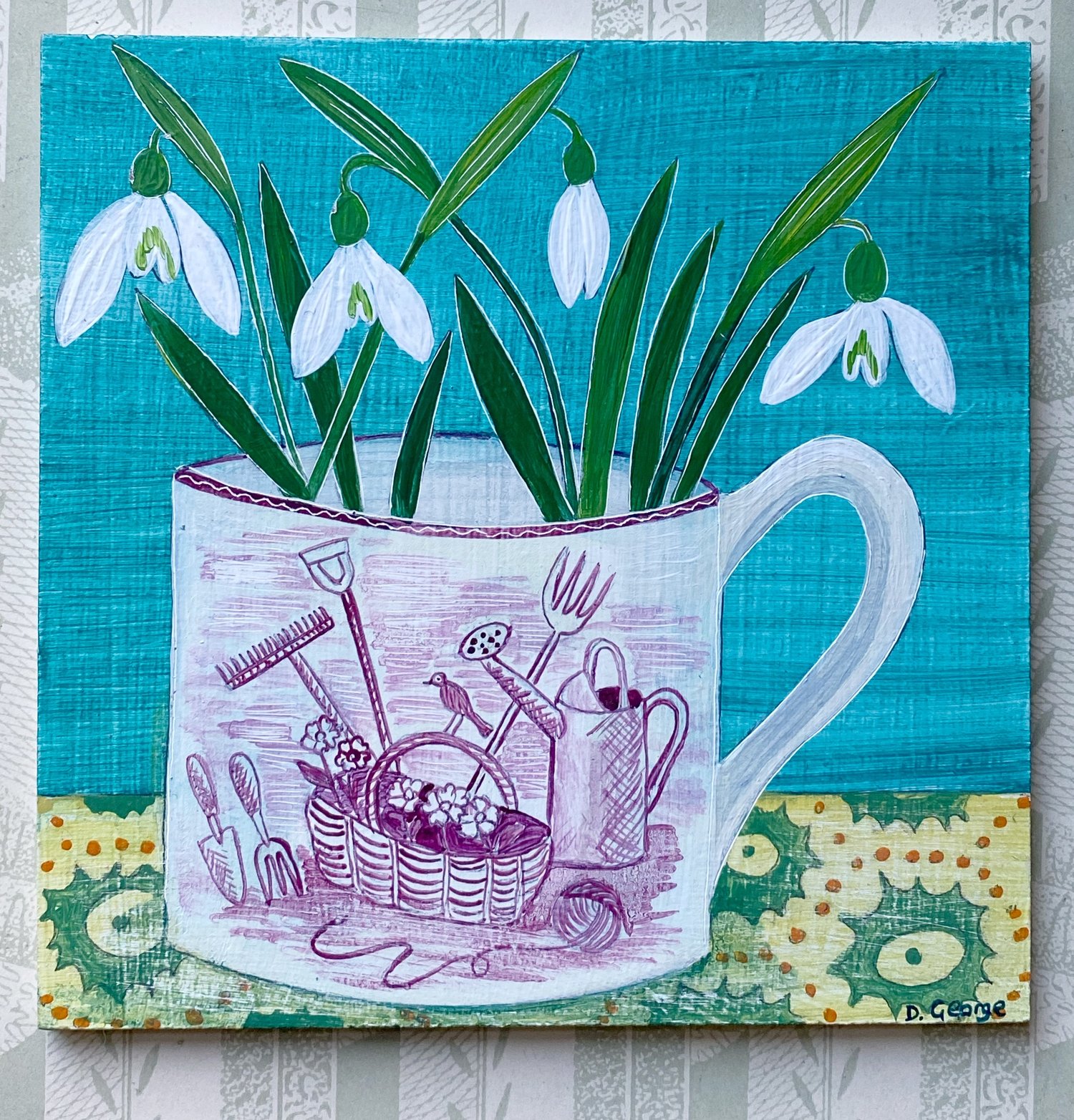 A miniature painting on gessoed board. Inspired by an illustration by Lawrence Mynott and Snowdrops.