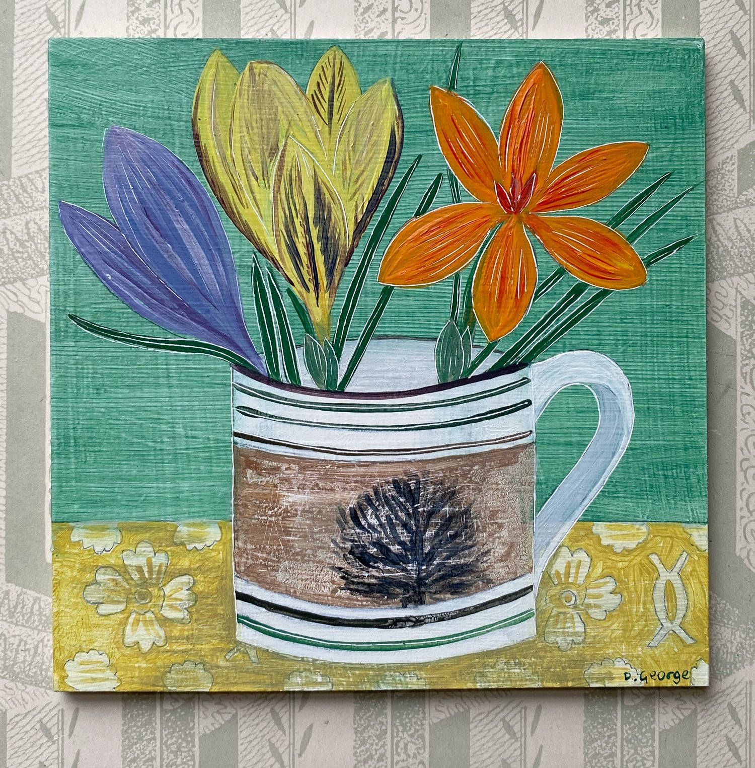 A miniature painting on gessoed board inspired by a child's mochaware cup and crocuses.
