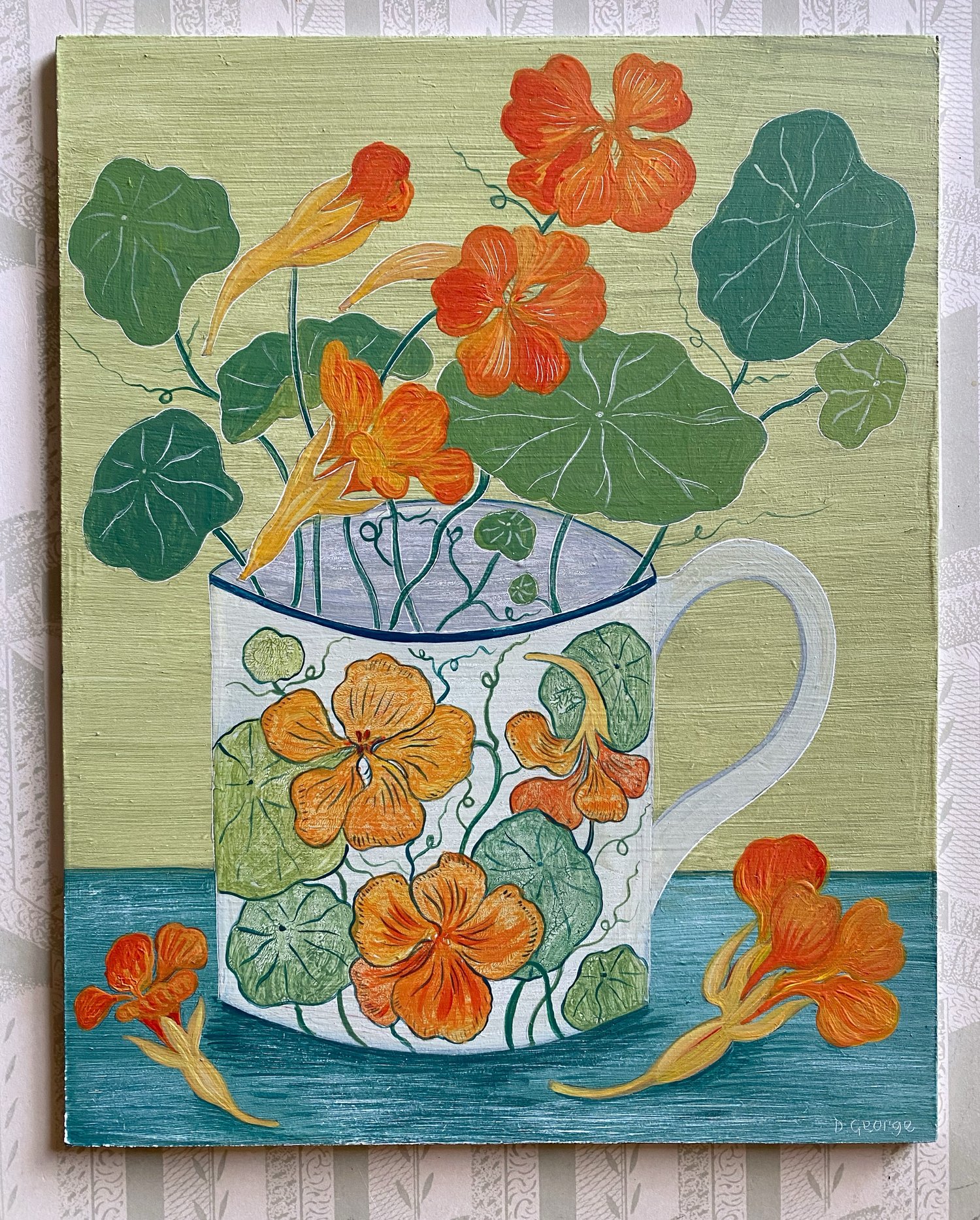 A new painting on gessoed board, inspired by Nasturtiums from my garden.