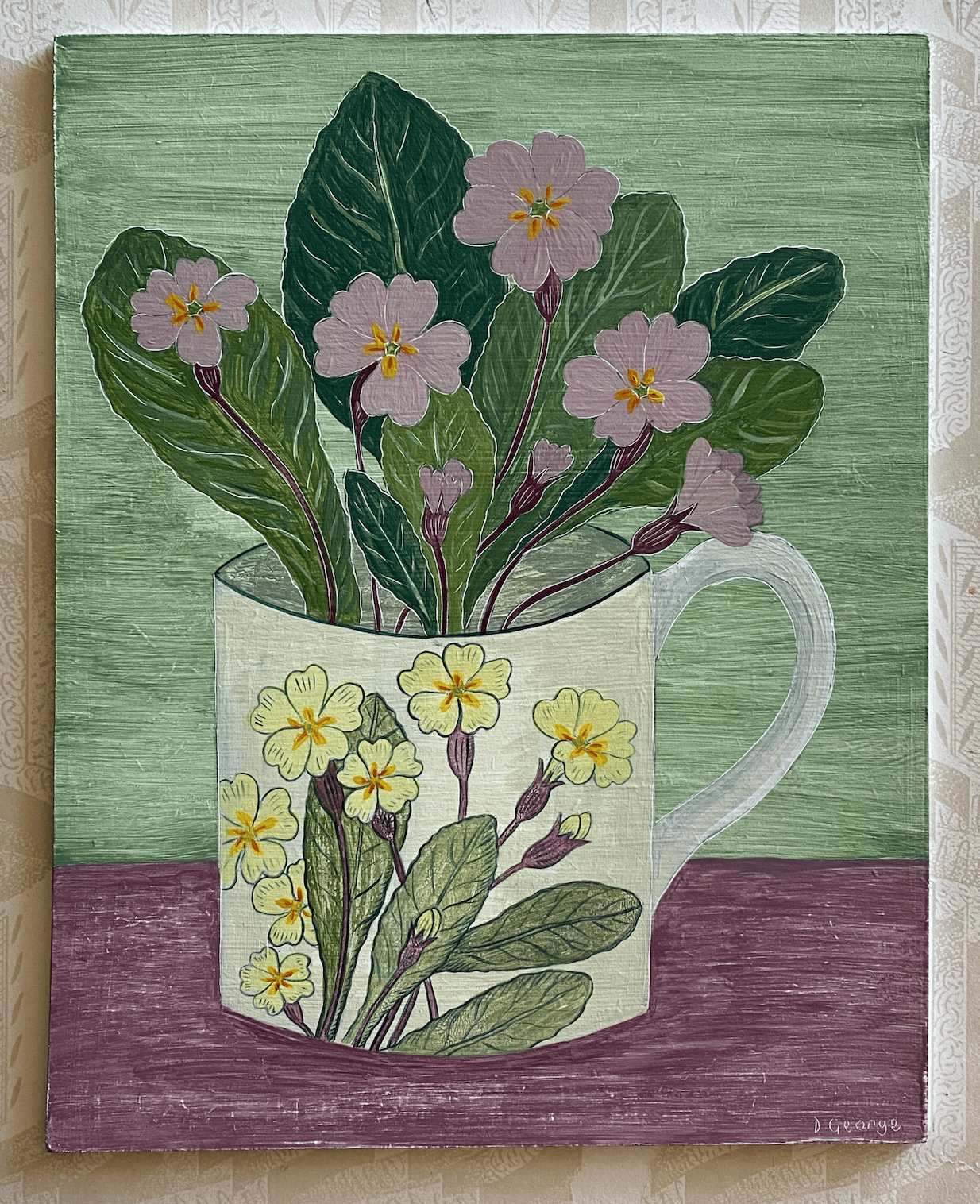 A new painting on gessoed board inspired by a vintage illustration of Primroses.