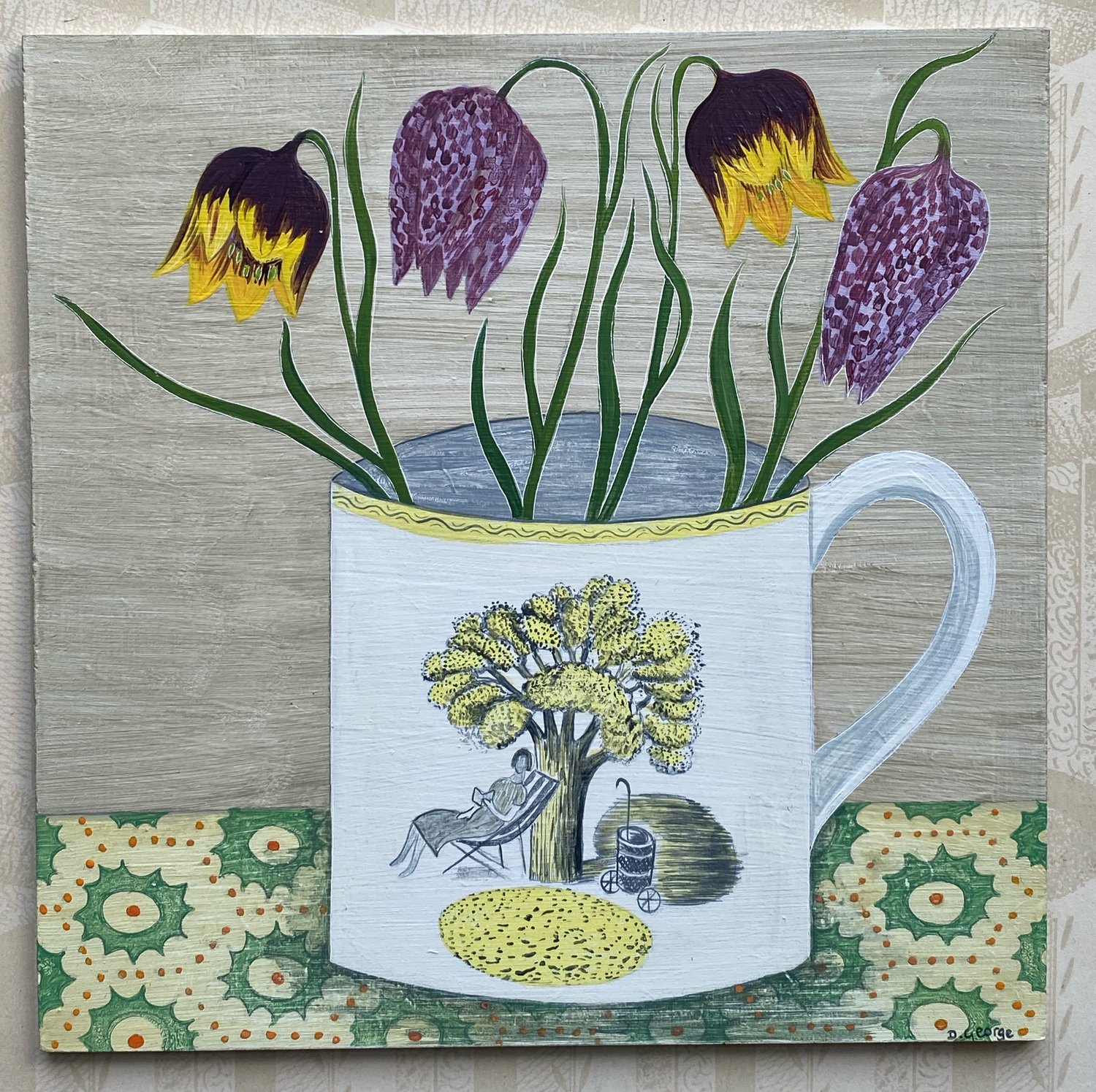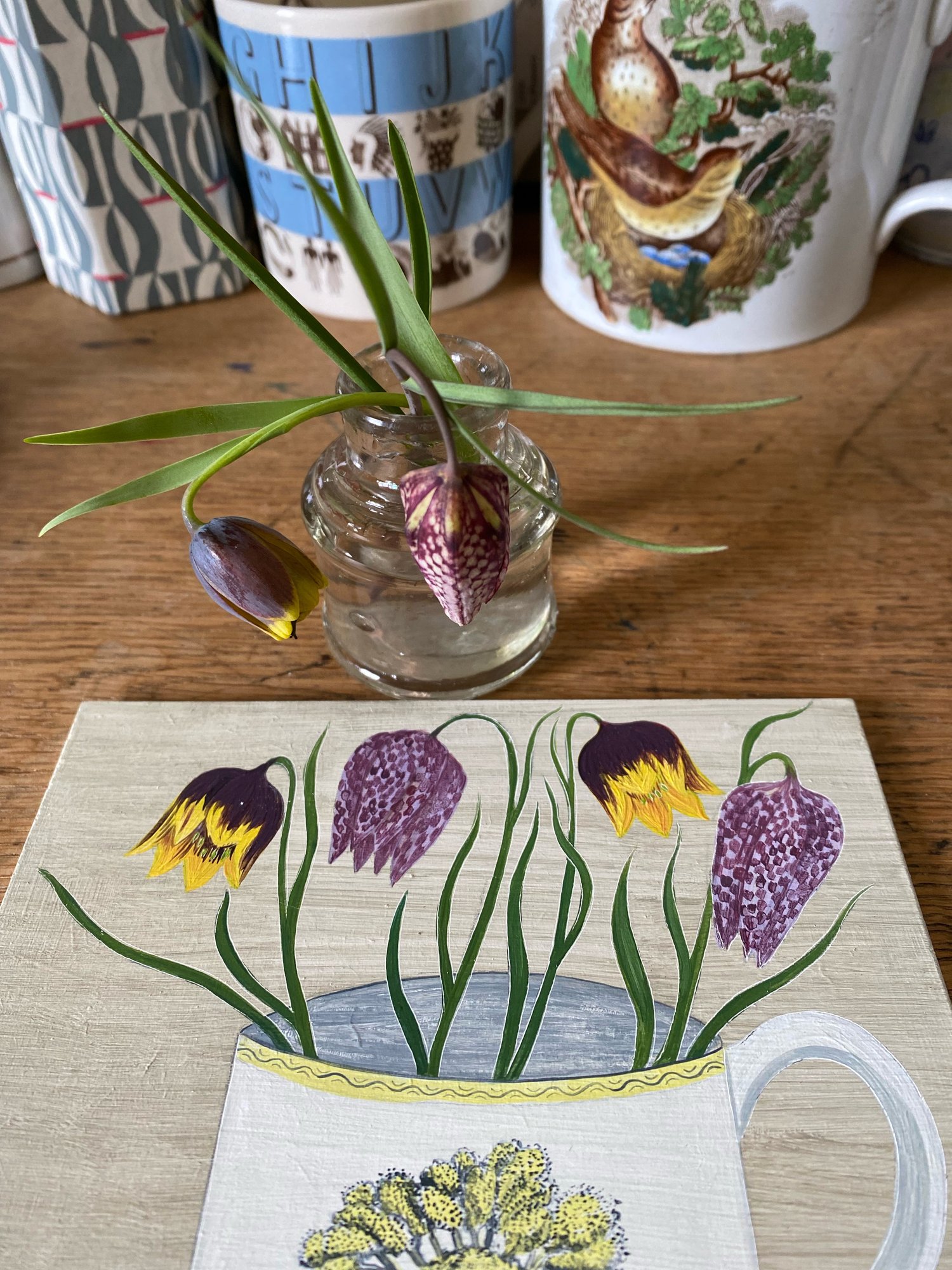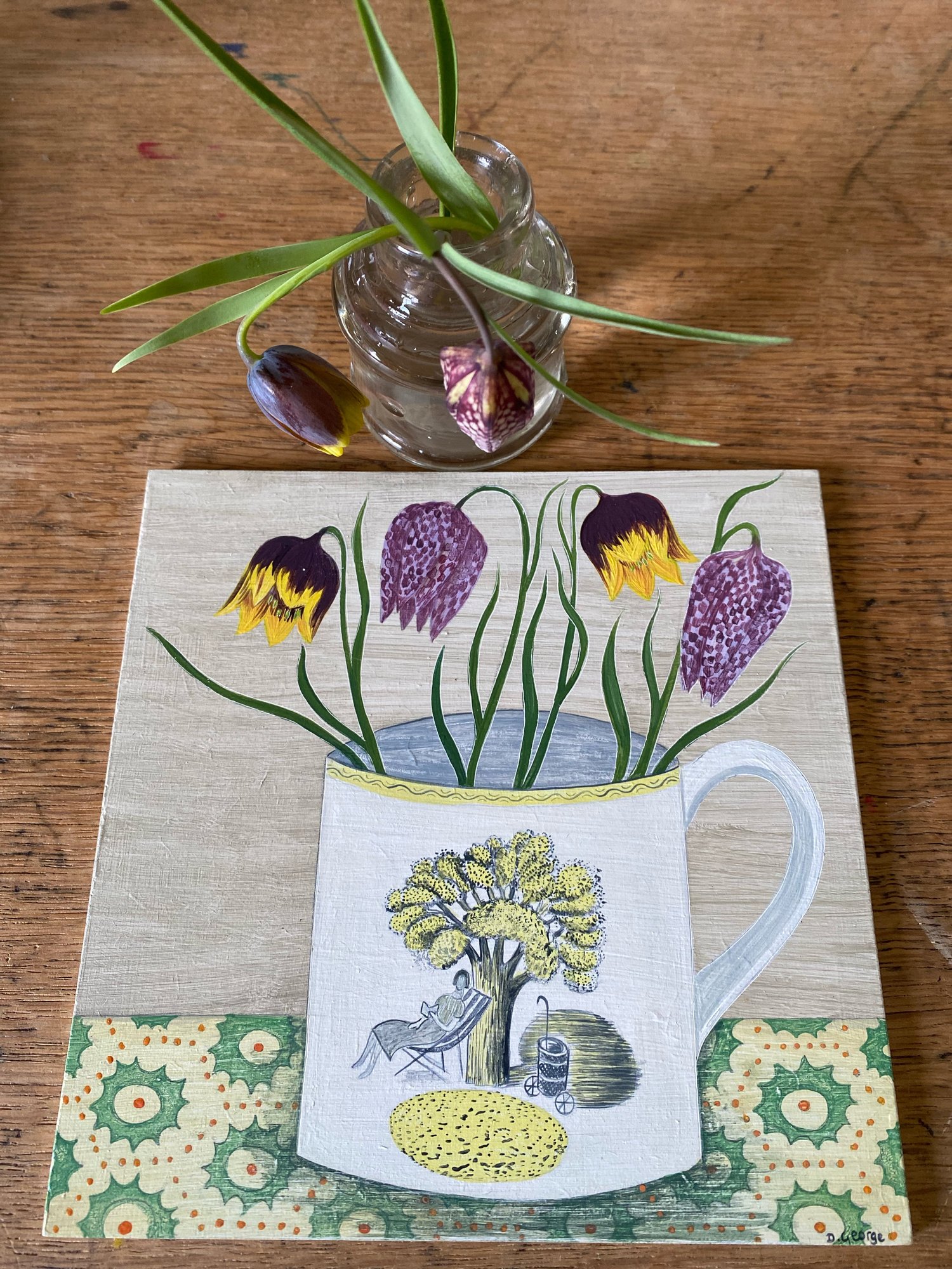 A new painting on gessoed board, inspired by an Eric Ravilious illustration and flowers from my garden.