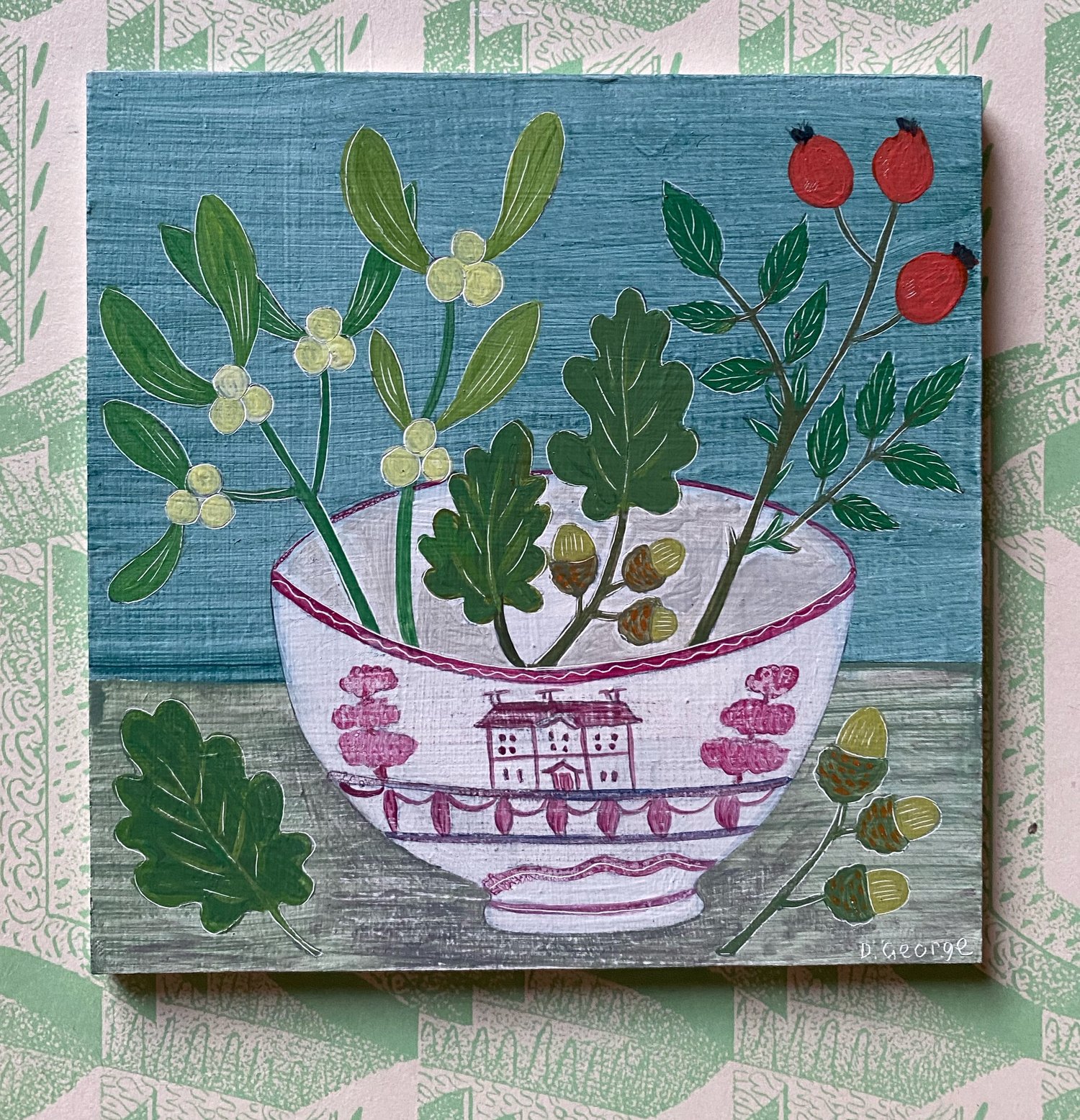 A new miniature painting on gessoed board, inspired by a lustreware design.