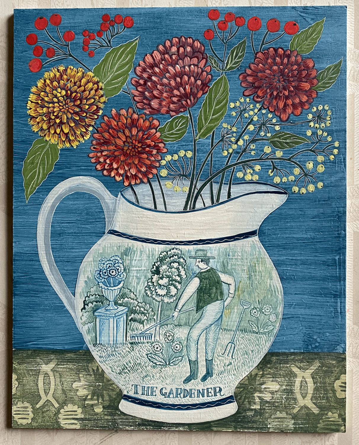 A new painting on gessoed board inspired by an antique transferware illustration.