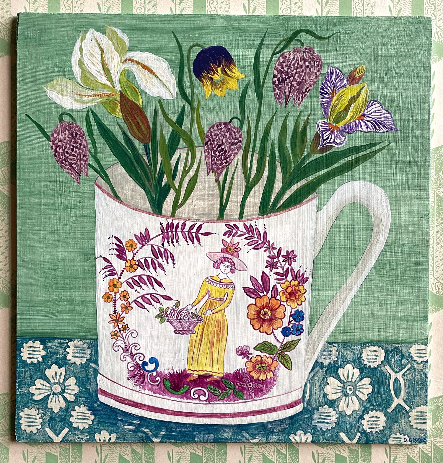 A new painting on gessoed board inspired by an illustration on a lustreware plate.