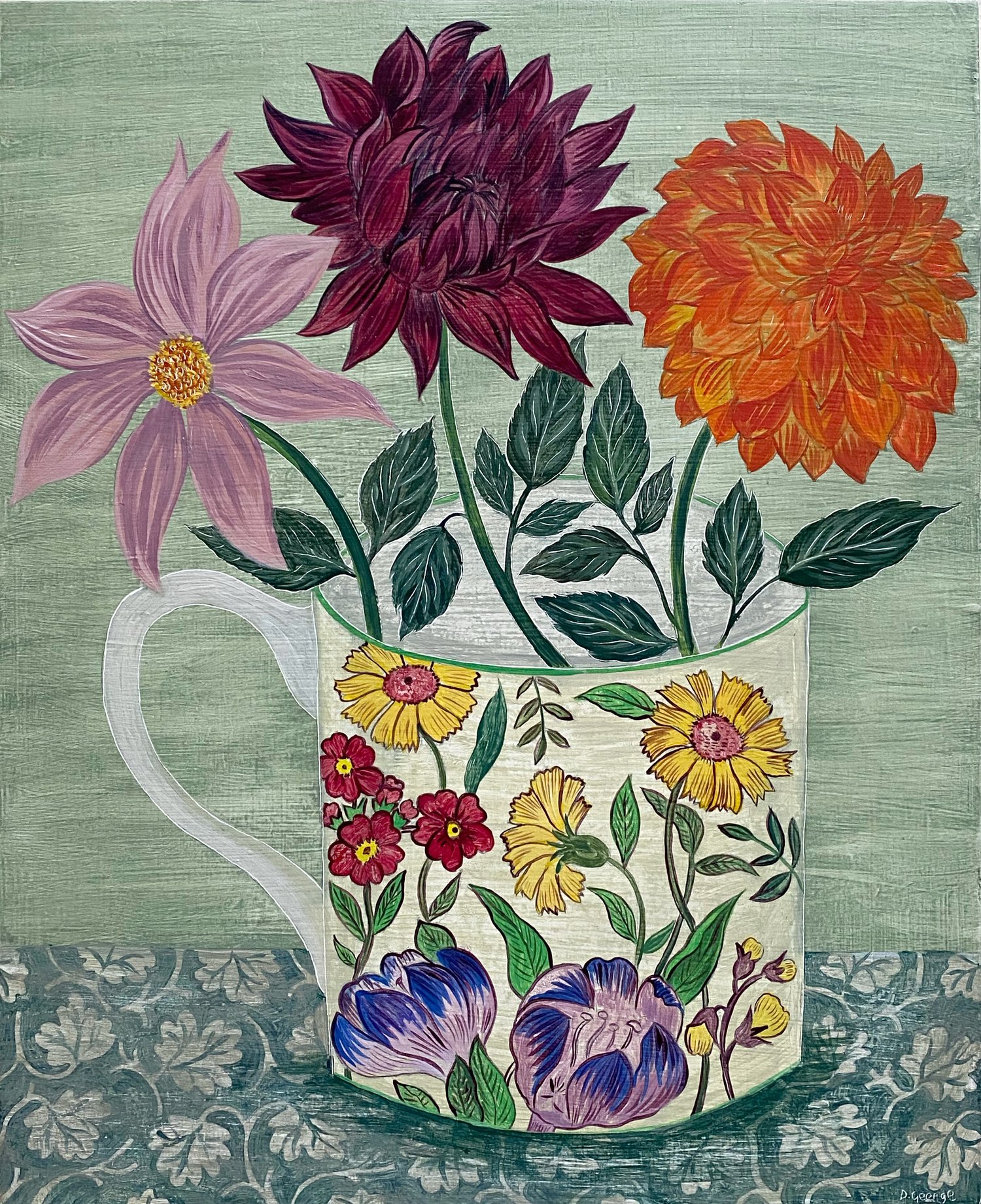 'Three Dahlias' A Giclee print, printed on high quality Hahnemuhle watercolour paper. The image area of the print measures 19.5 x 23.9 cm.