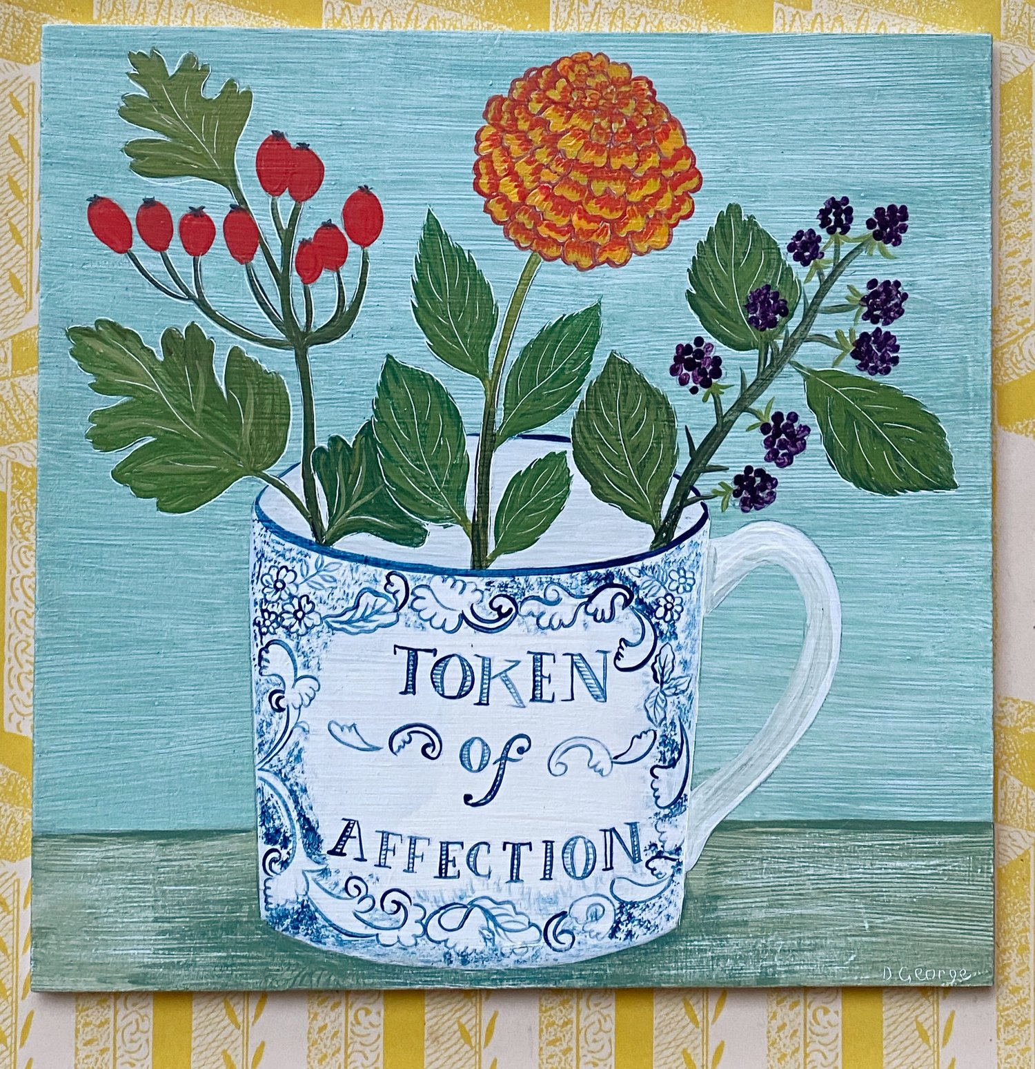 A new painting on gessoed board inspired by an antique child's motto cup.