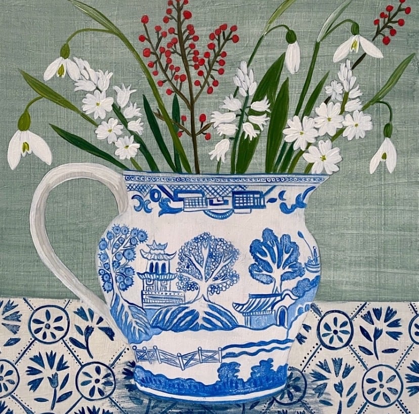 A new painting on gessoed board inspired by an antique willow pattern jug.