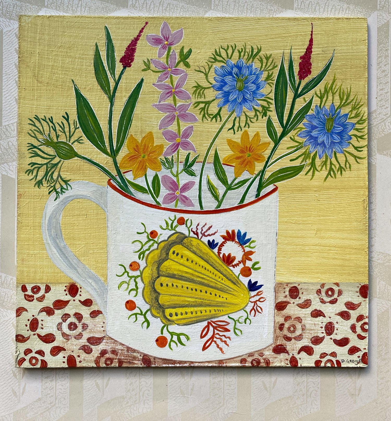 A new painting on gessoed board inspired by an antique cup with a hand painted shell design.
